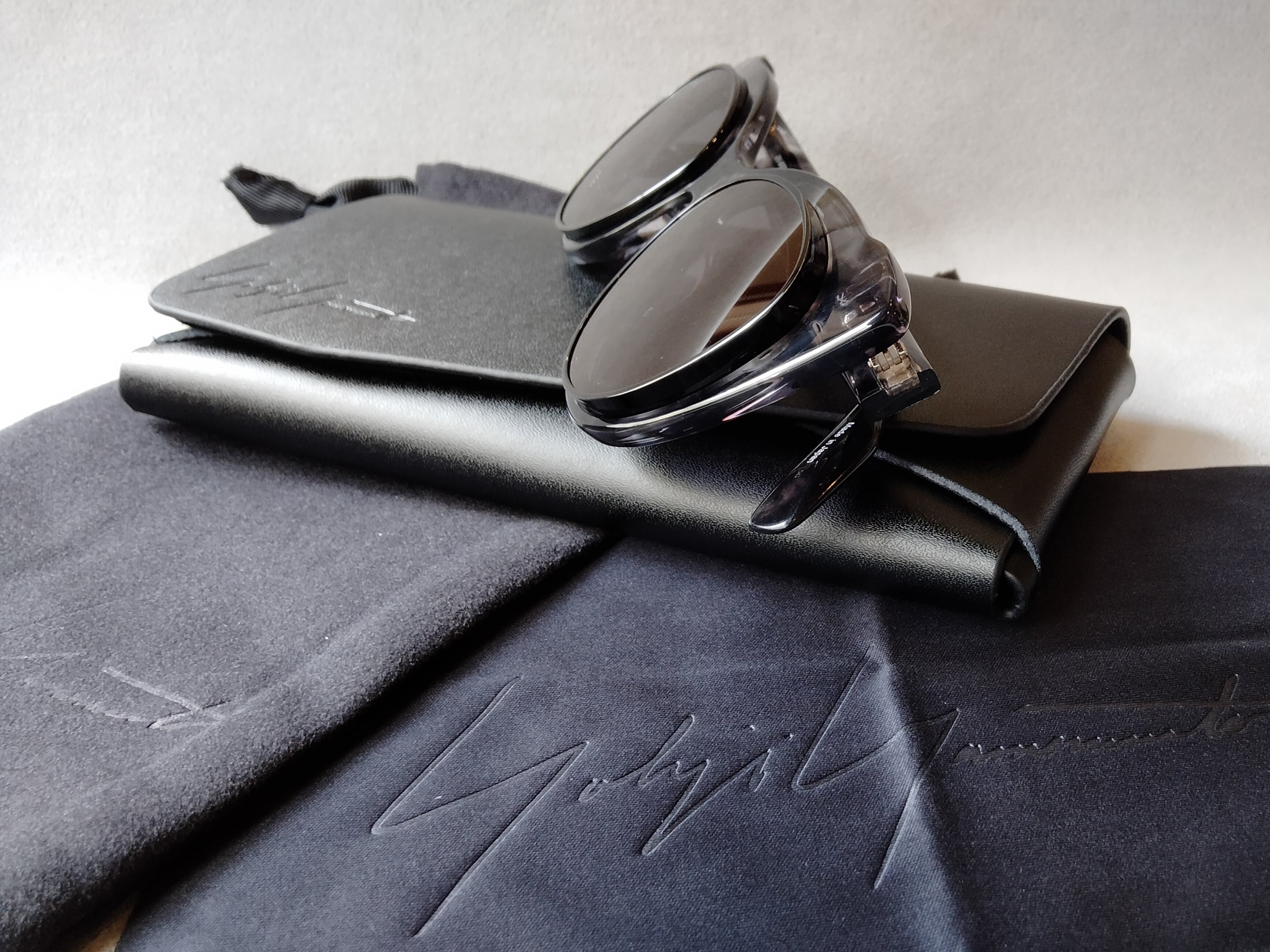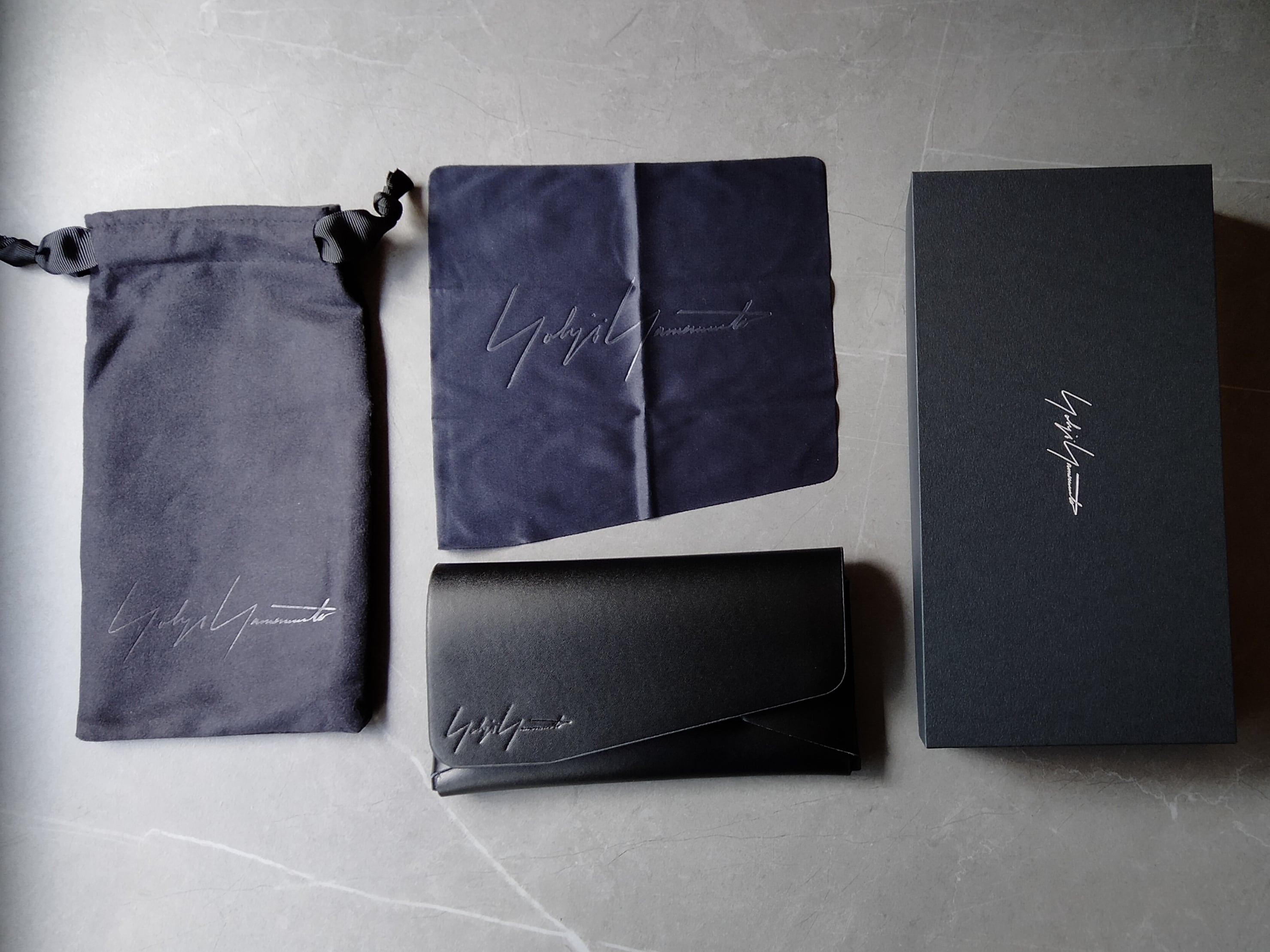 控えめながらも存在感のある型押しのロゴを刻印したマットな質感の本革が、静かな気品溢れる特別仕様のEYEWEAR CASE。それに合わせたEYEWEAR CLOTH、巾着、そいて化粧箱。細部にまで宿る静謐なラグジュアリーがプロダクトの世界観を余すことなく体現している。手にした瞬間から始まるヨウジヤマモトの物語の為に。