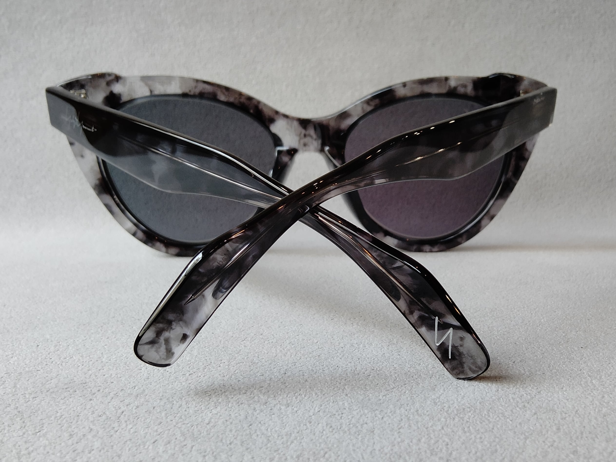 鋭さと華やぎを共存させたキャッツアイ×メタルリムシェイプの限定サングラス。クラシックなキャッツアイテイストを基調にフロント内側に大胆なメタルリムをインサート。陰影の強いアセテートに映えるメタルの輝きがエッジィで華やかなアクセントを演出。ヨウジヤマモトらしい緊張感とラグジュアリーな要素が共鳴する唯一無二のサングラスです。