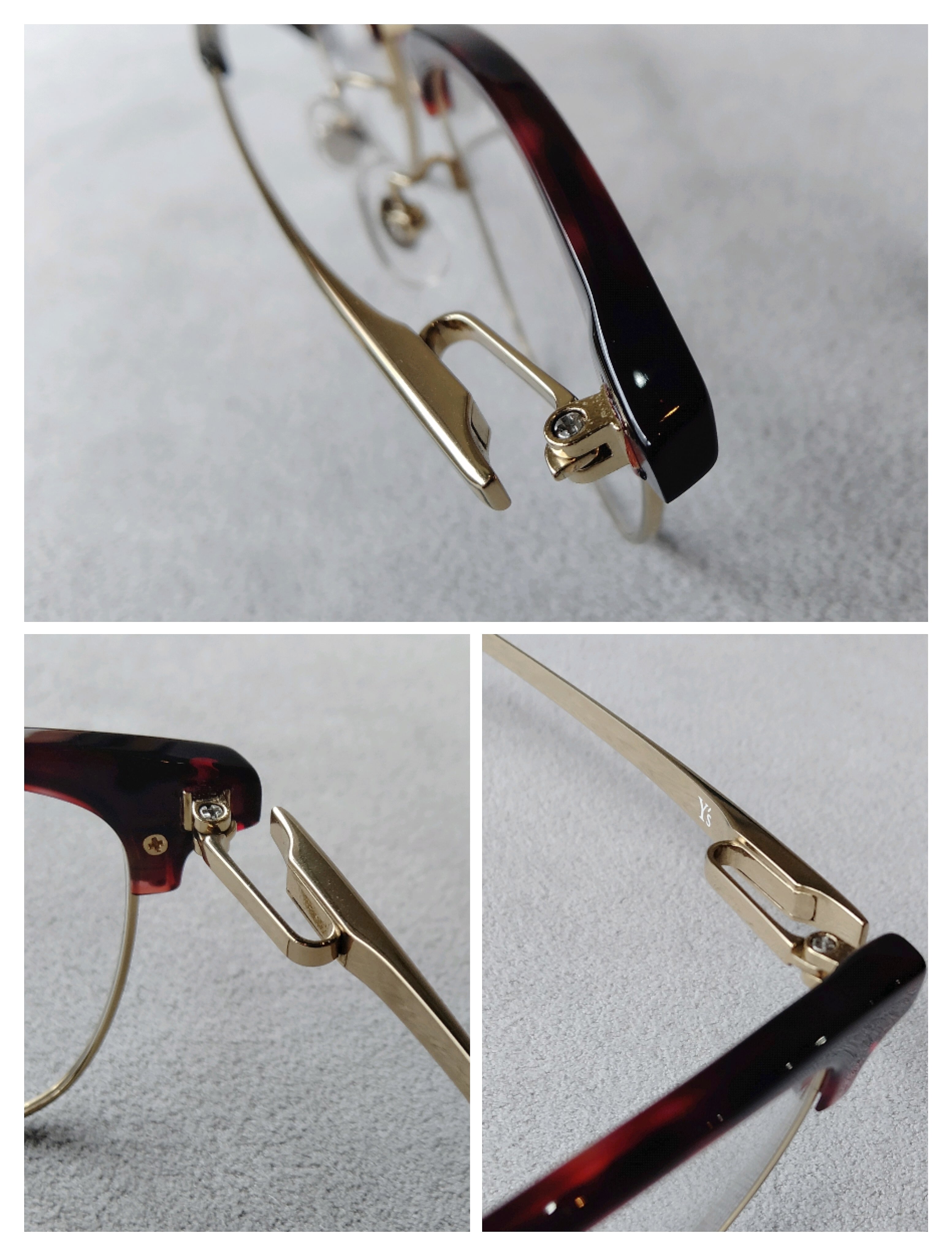 スタイリッシュさを加えたウェリントンスタイルにサーモントパーツを組み合わせることで、装いに上質な佇まいを添えながら、アンティーク感を表現しました。テンプル側面のベータチタンのクッションヒンジが、上質なかけ心地を提供します。