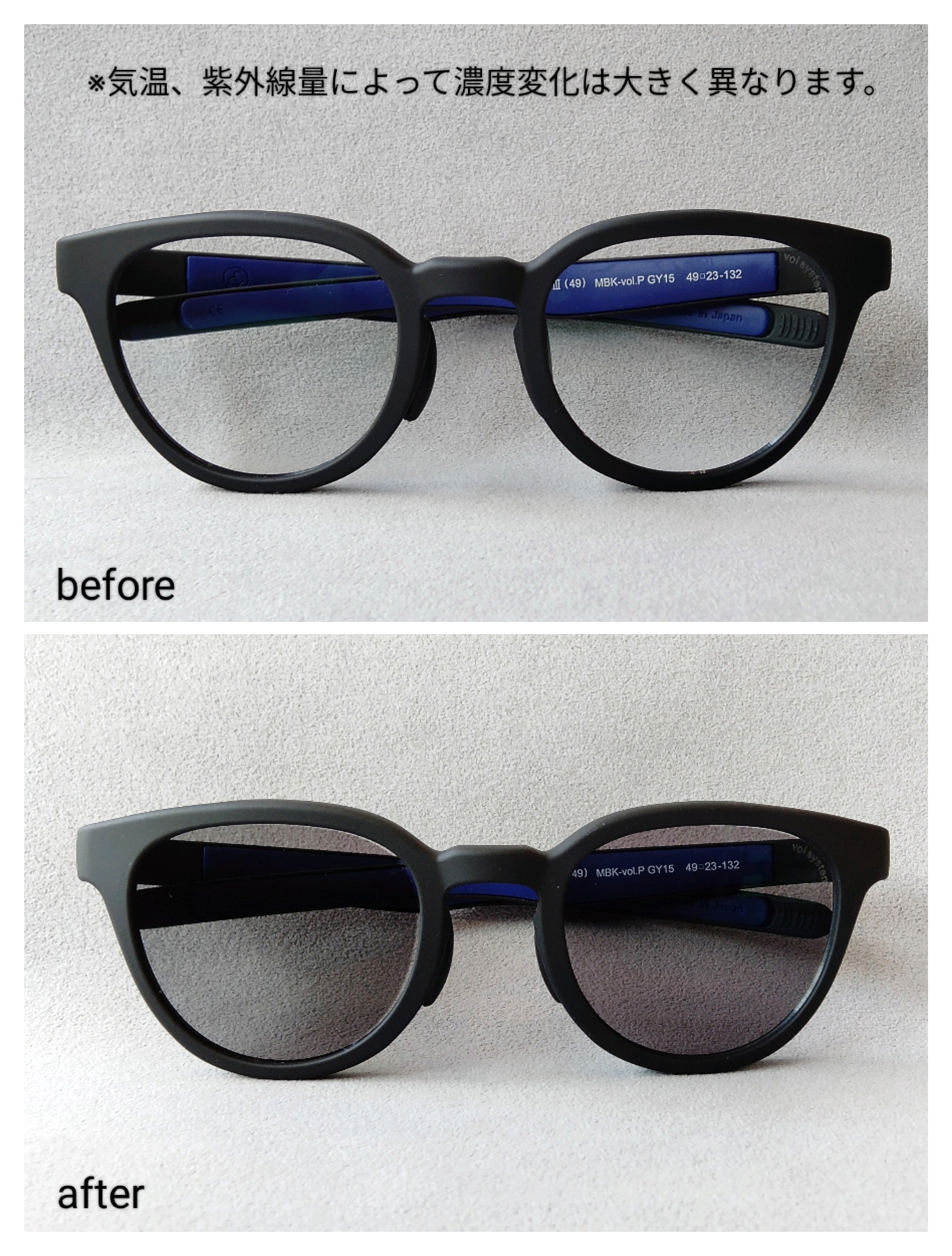 紫外線に反応して色が変化する調光機能を持つ。視認性と遮光性のバランスを考慮したオリジナルカラーを採用。屋外では紫外線量に応じて最大濃度約70%まで上昇し、即座にサングラスとしての機能を発揮。紫外線の届かない屋内でも常時15%濃度のライトカラーに設定することで、眩しさを感じやすい現代のLED照明下でもナチュラルな視界で目の負担を軽減する。
