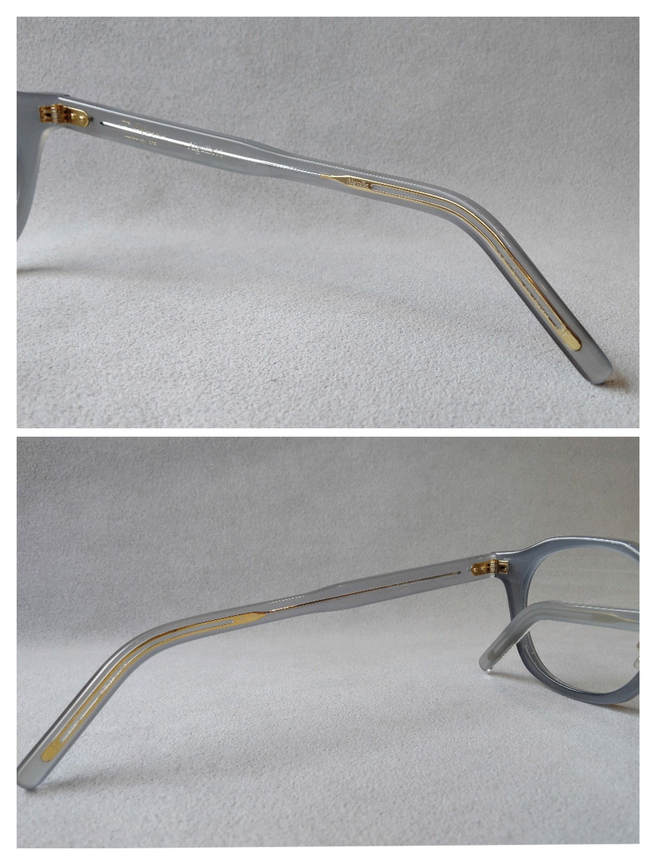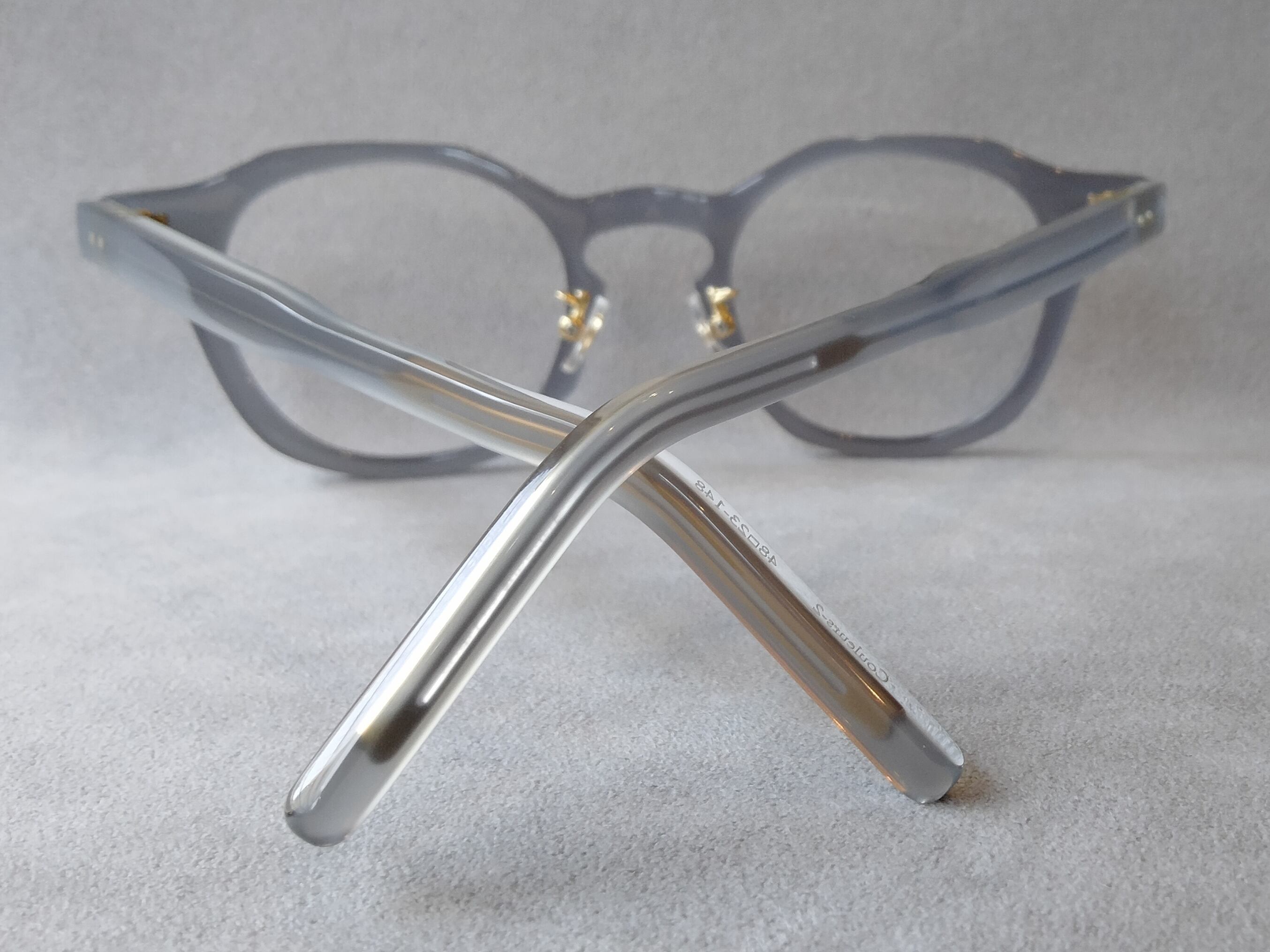 フィルトンの象徴的なシリーズ。パーツの随所にデザイナーの服やファッションへの思いやアイデアを詰め込んでいる。Aiguille(AG)シリーズの初期モデルはフレンチヴィンテージの小ぶりサイズのイメージだが、やや大ぶりのサイズ感で存在感をUP。6㎜生地を採用し、8㎜より軽く掛けやすさも重視。芯張りには縫い針を象り、針にレーザーで細かい文字を刻印。左右に日本語とフランス語で「縫い針」という文字だけでなく、「感覚こそ全て」「真実と嘘」とフランス語で刻印された文字を探してみるのも楽しみの一つ。今モデルはチタン製クリングスアームノーズパッドにボタンとボタンホールを刻印した過去のチタンパッドではなく、新たに採用した新パッドを付けより軽やかな装着感と見た目を演出。