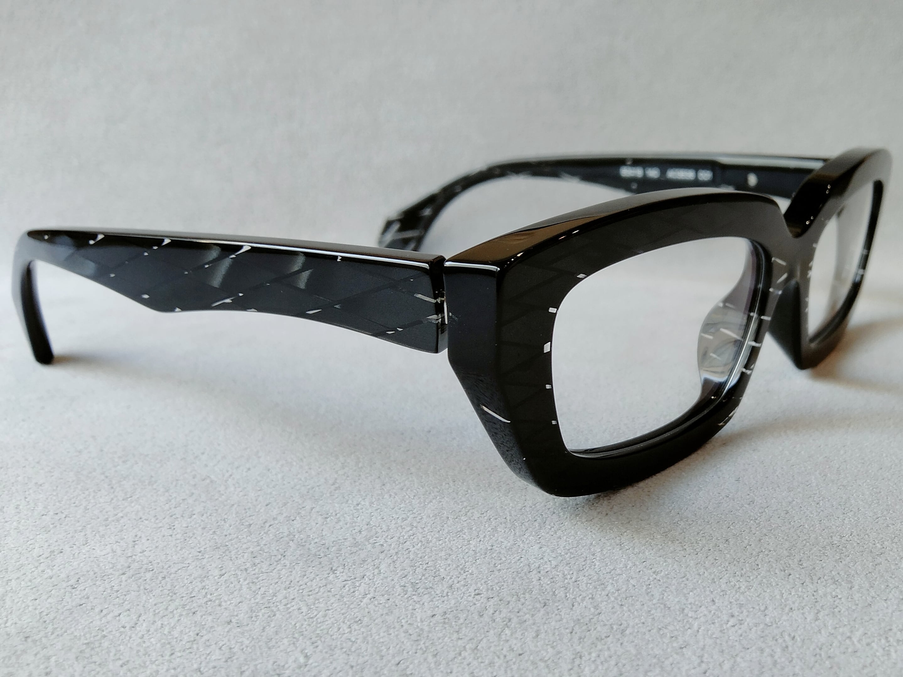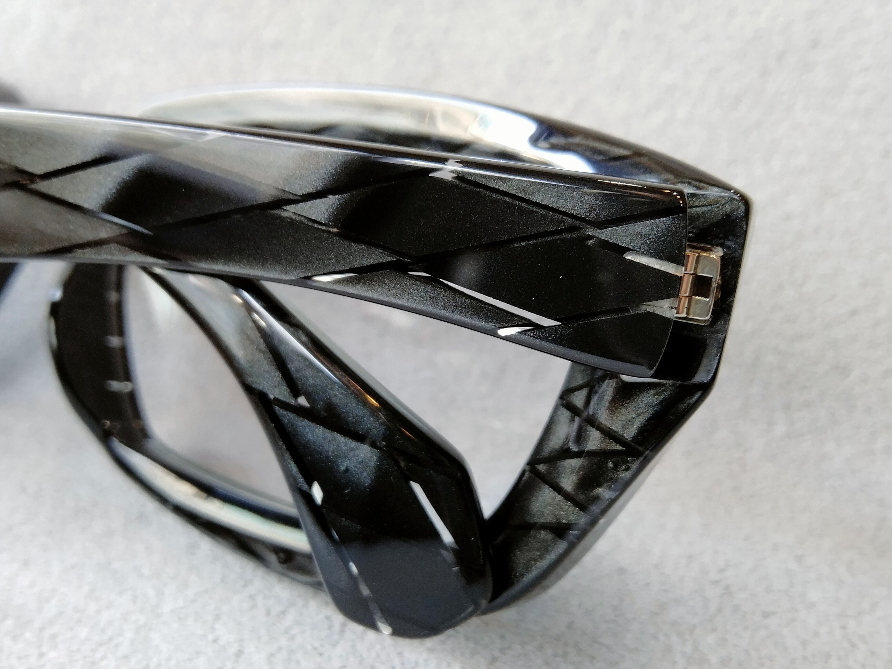 ・EYEWEARデザインの一線から退いていたアラン・ミクリ氏がデザイナーに復帰したコレクションライン。80年代後半から90年代に日本中のファッショニスタを魅了した頃のスクエア調のモードスタイルを彷彿とさせるデザイン。よく見ると、フロントの左右端のテンプル丁番付け根の生地の厚みが左右非対称。これも当時のミクリの遊び心満載の一つ。また、厚みを変えることで開閉時のたたみがきれいに収まりよくなる機能面のメリットとしても考えられている。ミクリ特有の特注生地、ひし形の柄模様のBlacKが高級感ある佇まいを演出。alain mikli アイコンのバネ丁番設計も改良され、掛け心地のよいモード感満載の1本。