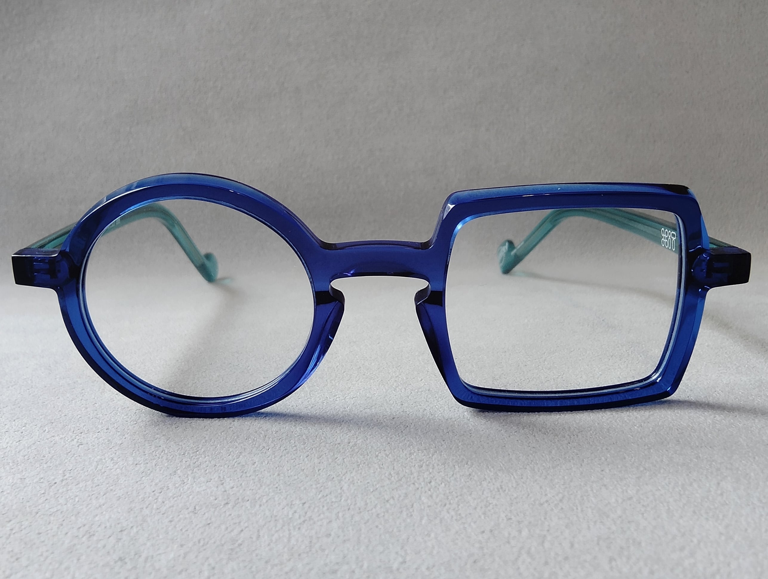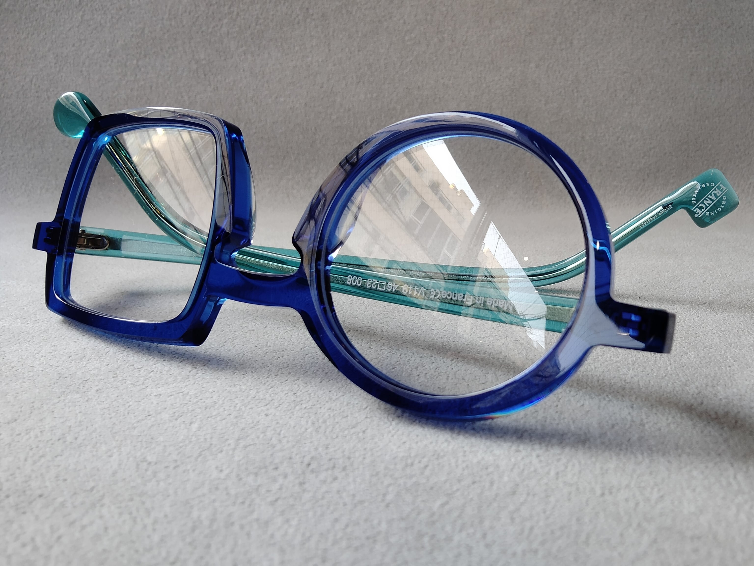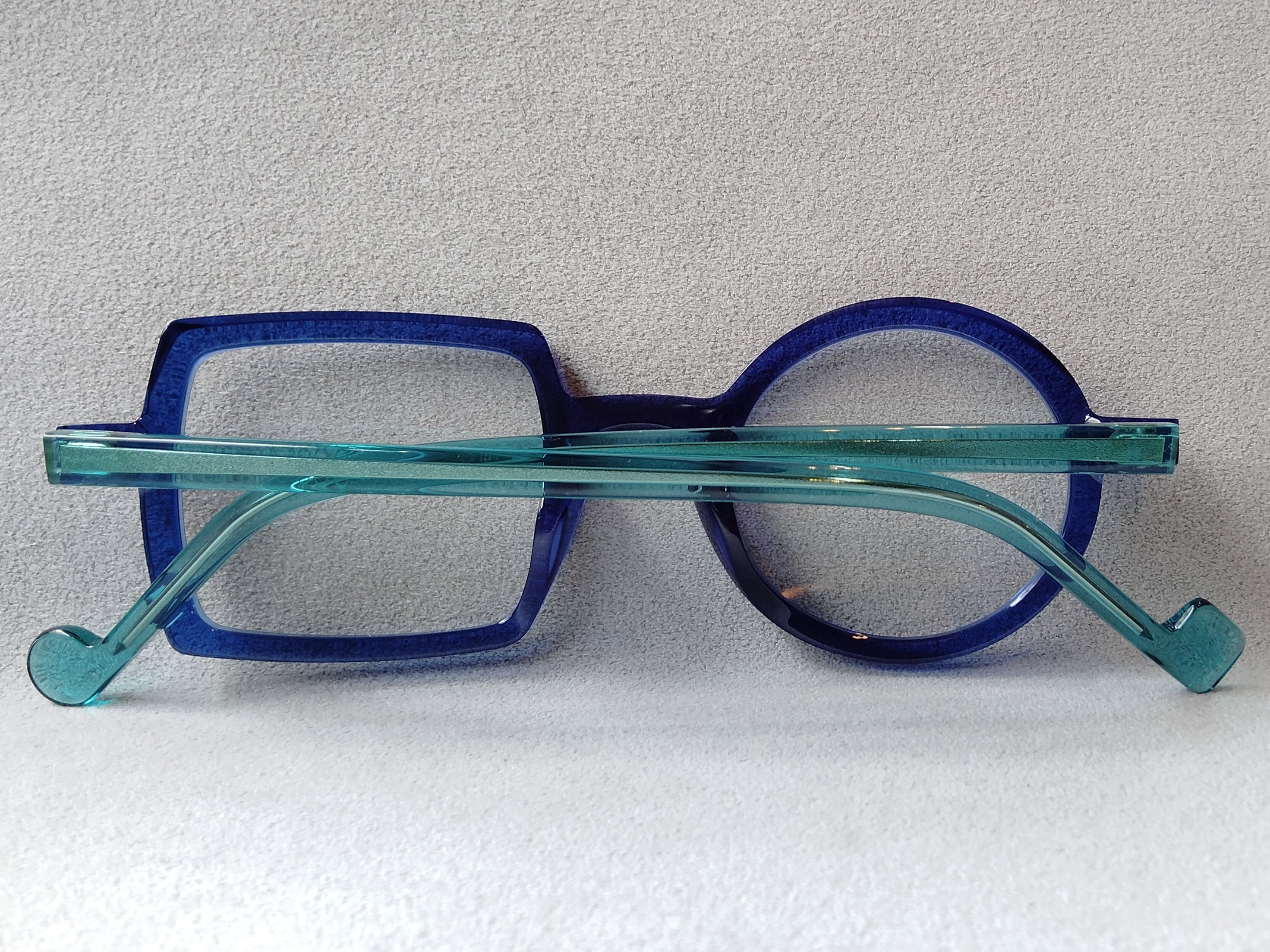 ブランドの定番、レンズのシェイプを丸と四角にした左右非対称モデル。イタリアMAZZUCCHLLI社製の高級アセテート生地を用いてフランスでハンドメイド。カラーのコントラストもデザインにメリハリを効かせている。ノーズパッドはアジア人でもフィット可能なやや高めに設定されている。