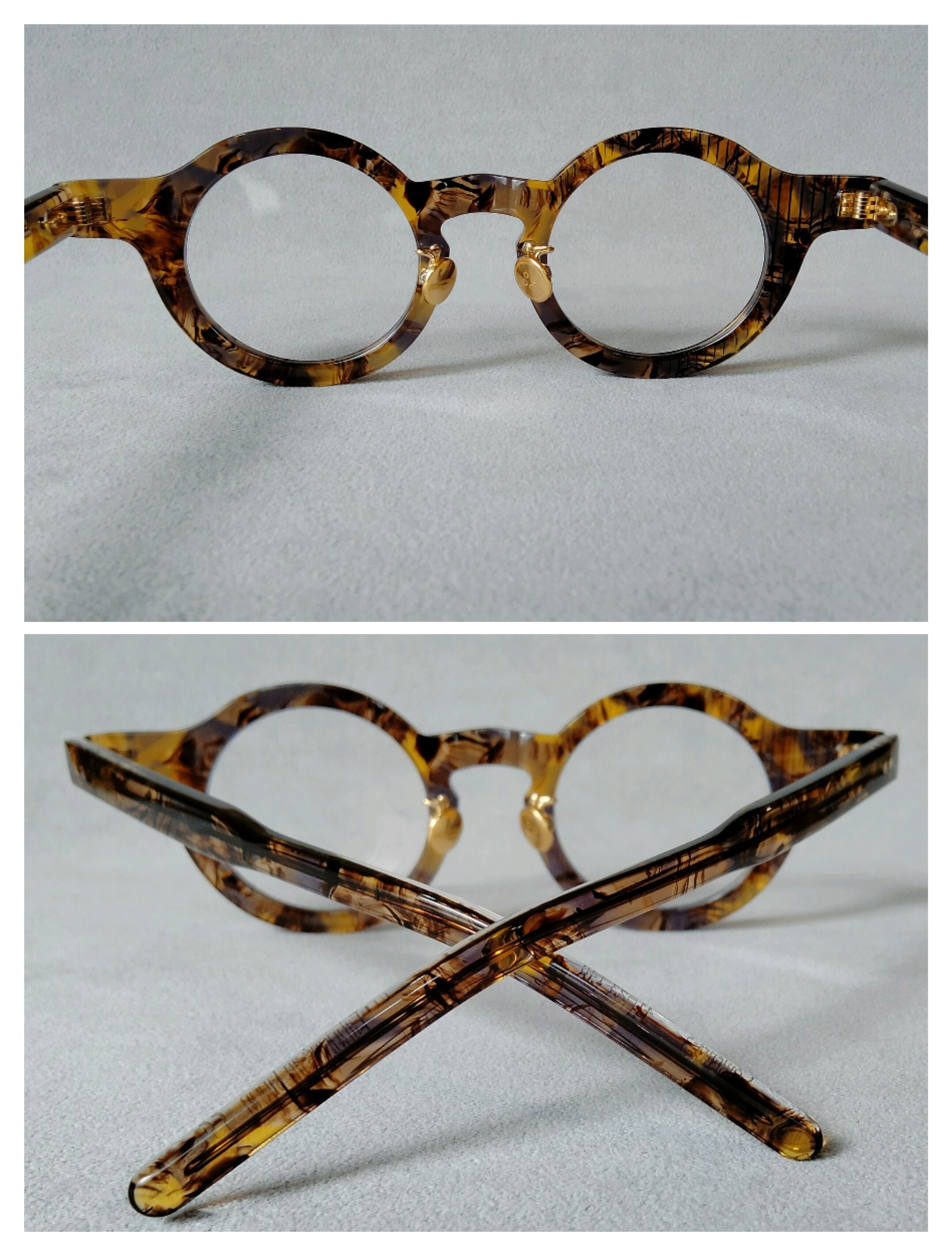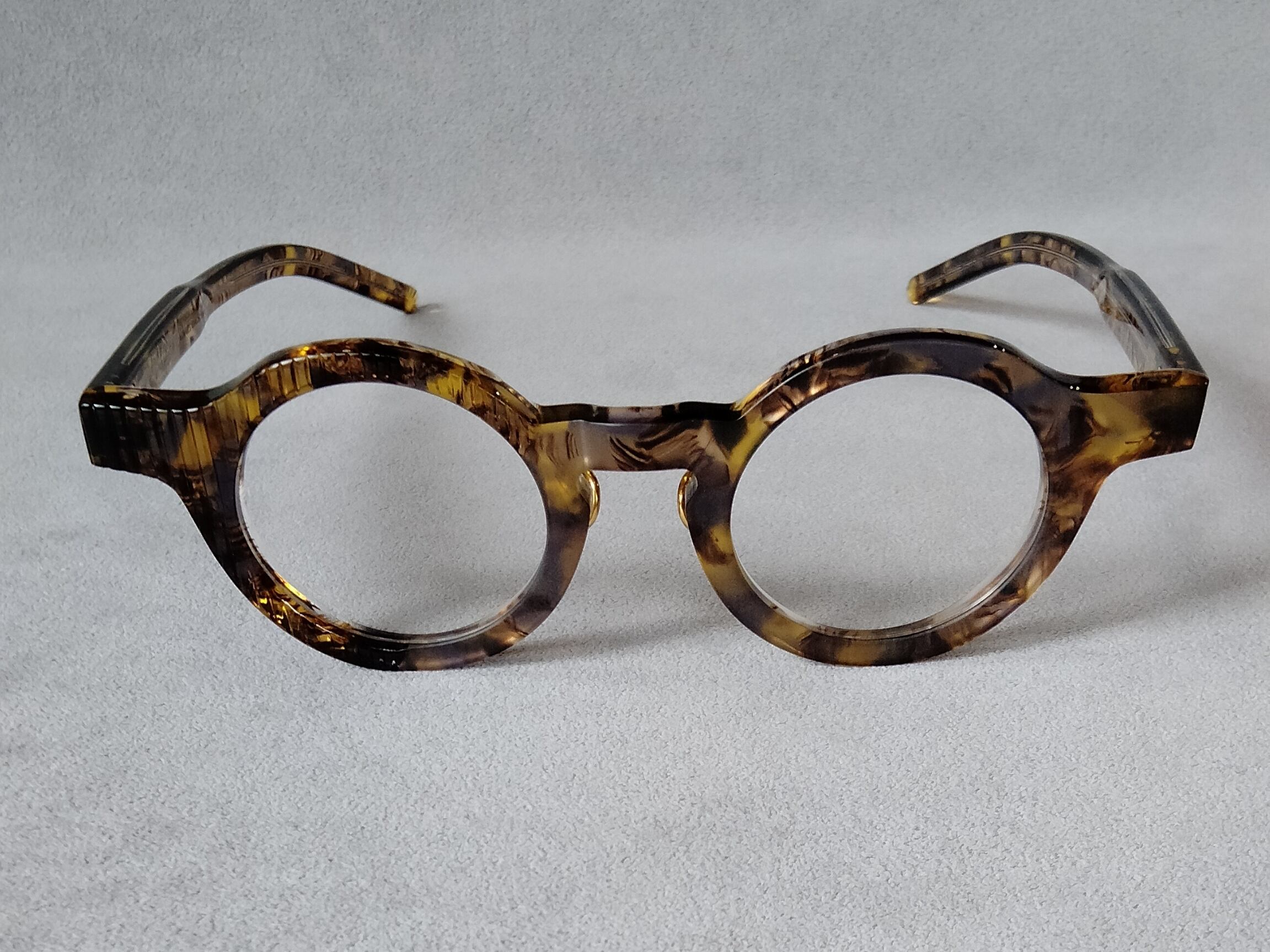 眼鏡職人×美術技法から生み出される「コラージュ」をコンセプトにありとあらゆる性質とロジックの異なる素材を組み合わせ芸術的な創作技法や美術技法を取り入れたEYEWEAR。どこかフランスのヴィンテージ眼鏡っぽい香りがするデザインと日本の眼鏡職人のハンドメイドの仕上がりに、学生時代から美術とファッションに没頭してきたというデザイナーの感性が合わさり他の鯖江眼鏡とは全く異なる作品に仕上がっています。
