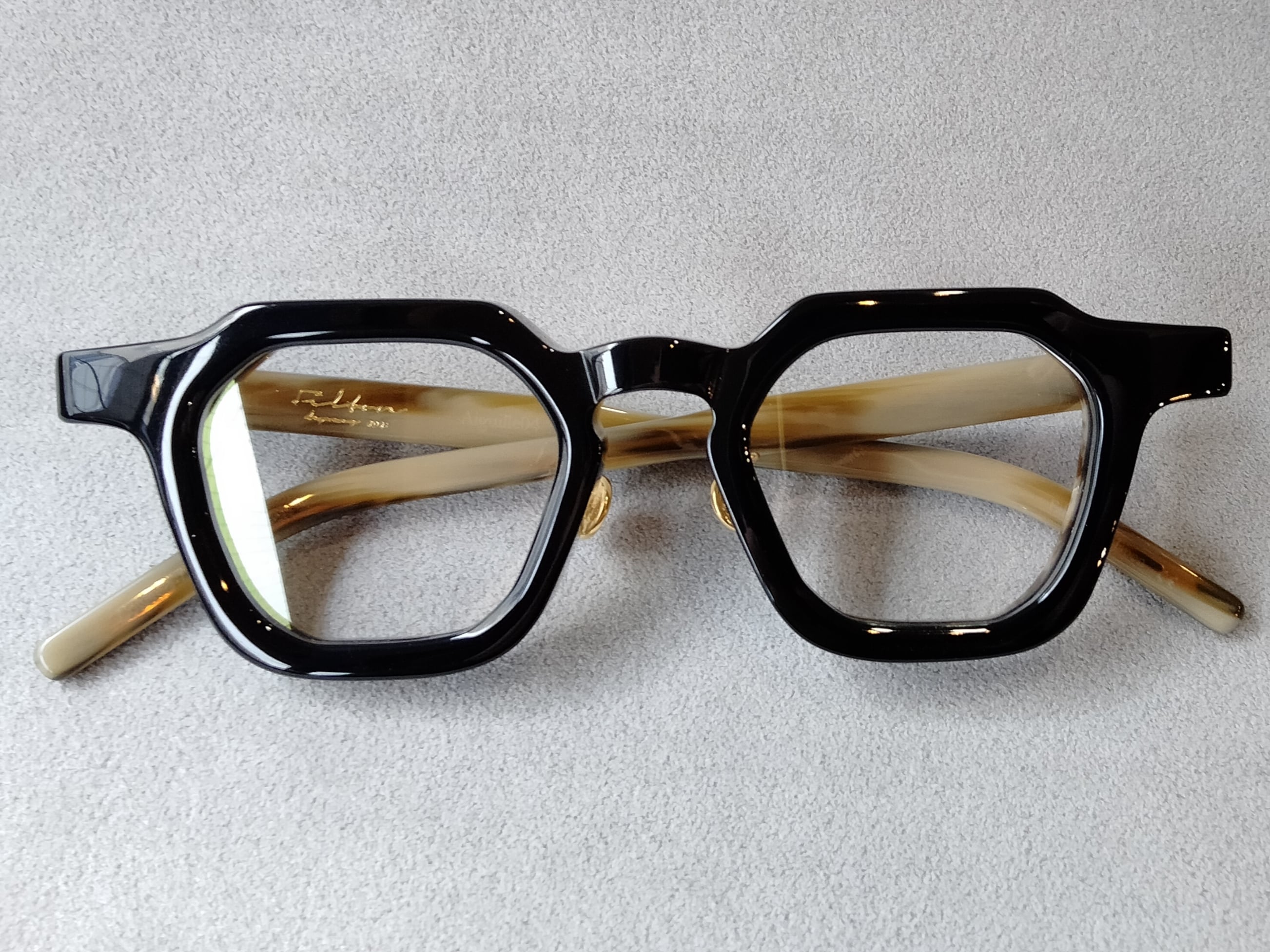 フィルトンの象徴的なシリーズ。パーツの随所にデザイナーの服やファッションへの思いやアイデアを詰め込んでいる。直線的なシルエットだが、随所に丸みを帯びた独特のデザインと、生地のカラーに拘ったモデル。芯張りには縫い針を象り、針にレーザーで細かい文字を刻印。「縫い針」という文字だけでなく、「感覚こそ全て」「真実と嘘」とフランス語で書かれた文字を探してみるのも楽しみの一つ。チタン製ノーズパッドにはボタンとボタンホールを刻印したFiltonの代表シリーズです。