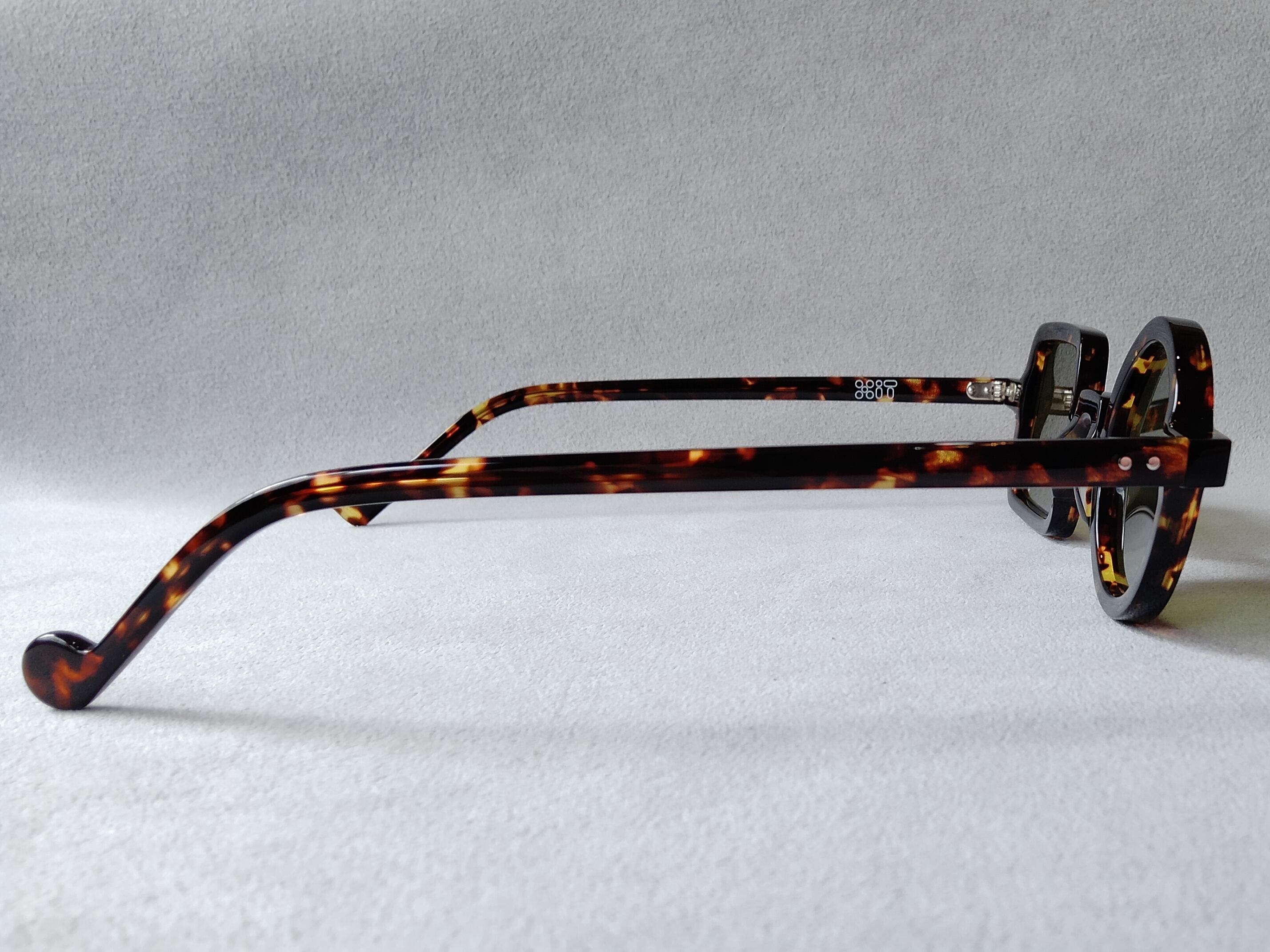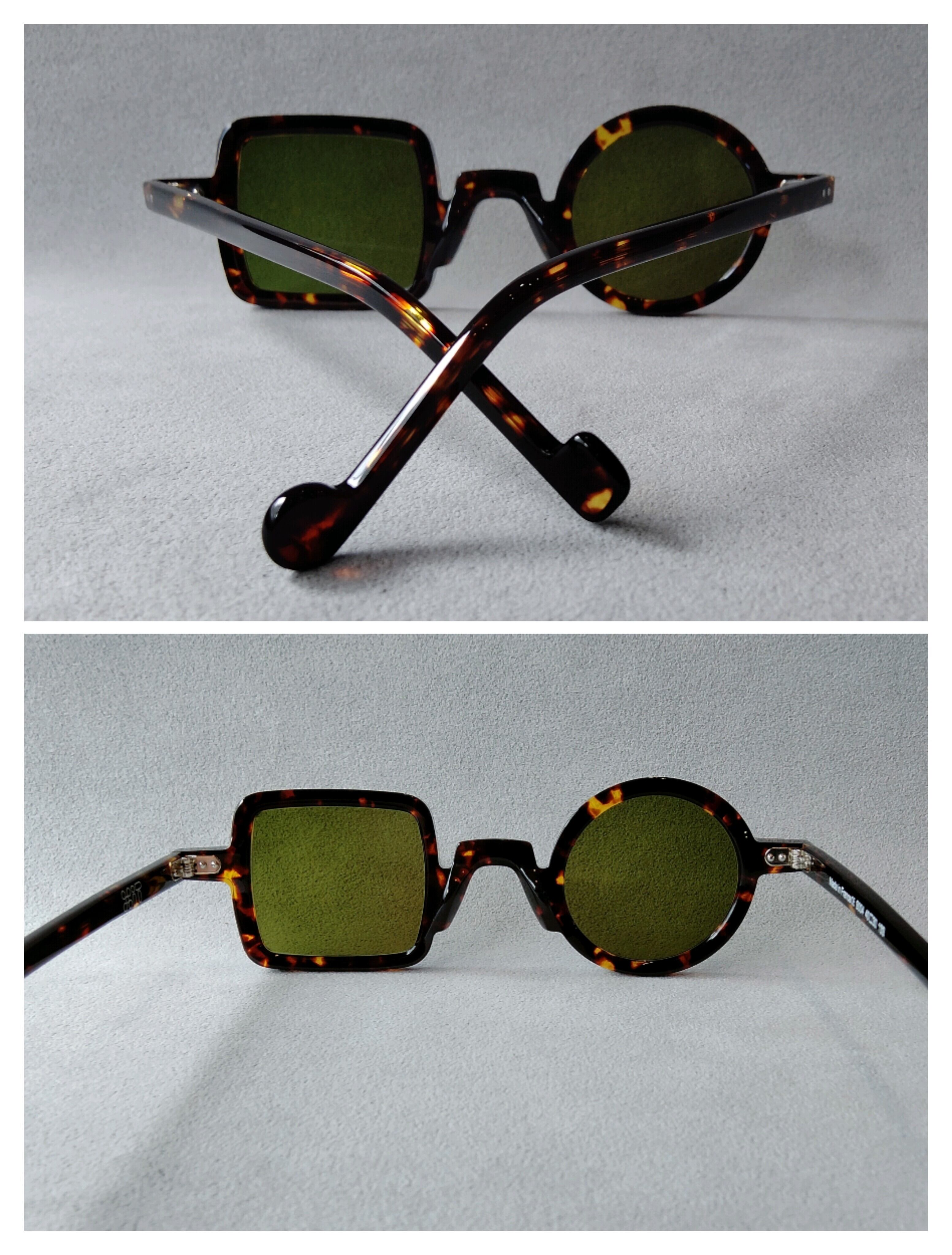 ブランドの定番、レンズのシェイプを丸と四角にした左右非対称モデル。